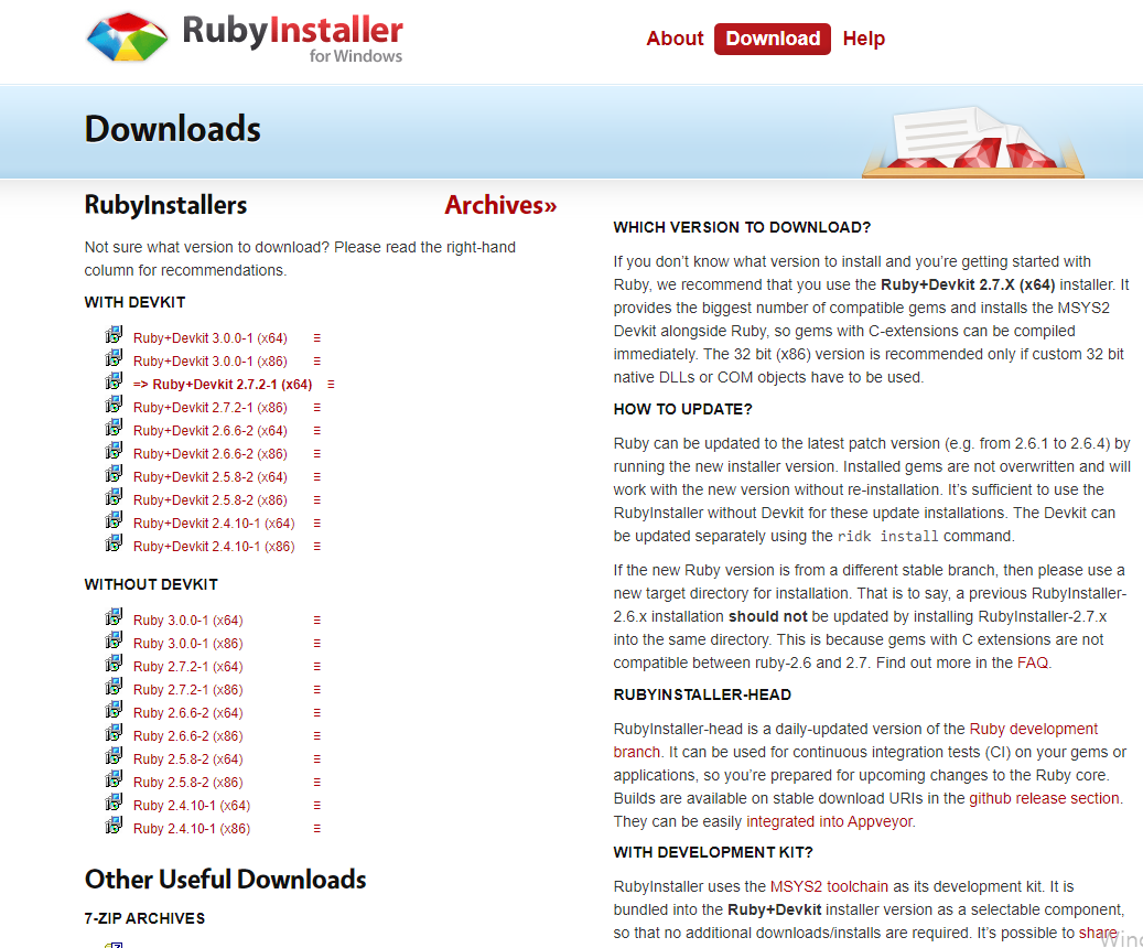 Which version to download? If you don’t know what version to install and you’re getting started with Ruby, we recommend that you use the Ruby+Devkit 2.7.X (x64) installer. It provides the biggest number of compatible gems and installs the MSYS2 Devkit